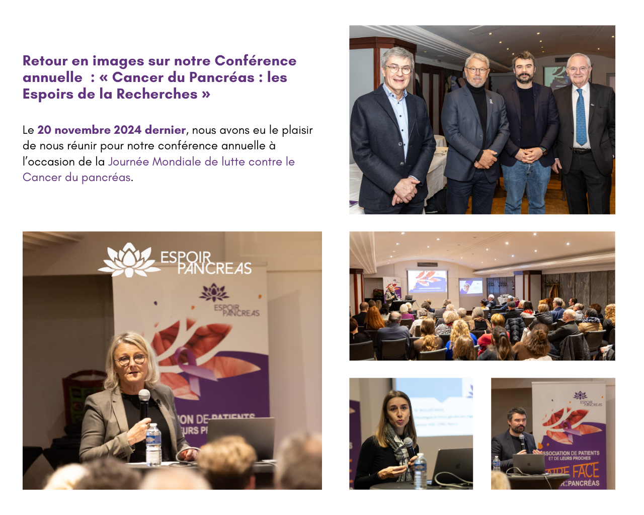 Le 20 novembre 2024 dernier, nous avons eu le plaisir d’organiser notre conférence annuelle à l’occasion de la Journée Mondiale de lutte contre le cancer du pancréas. Un moment précieux d’échanges et de partage autour de la lutte contre ce cancer.